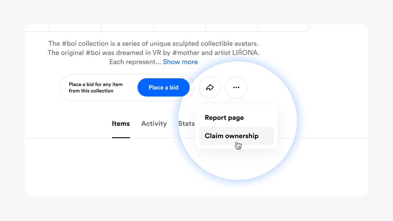 - Click the three dots and hit "claim ownership". If you're signed in with the right wallet, you'll get a success message.