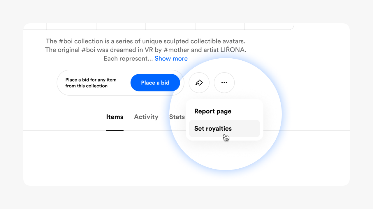 Royalties? Yes! Click the three dots again and you'll see the option to set royalties. Click that option and choose the settings you want.