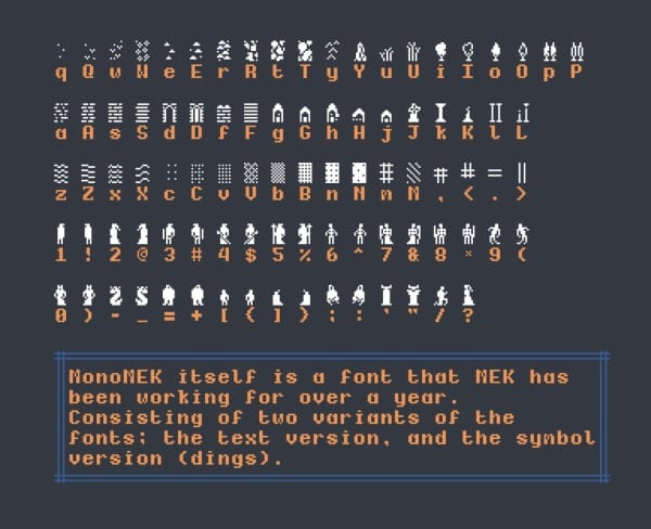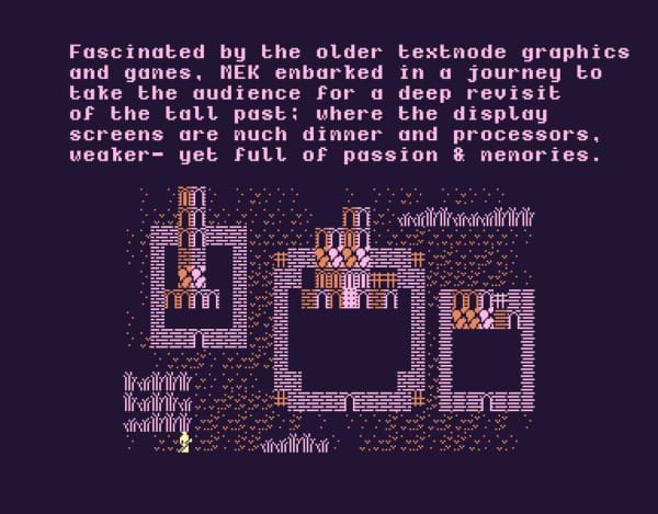 On old computers, text-mode displays used a limited set of predefined character tiles to create graphics and text, rather than processing each individual pixel. By combining these tiles, computers could display images more efficiently and use less memory than handling every single pixel on the screen. No surprise that artists have found a way to use this technique for their creative endeavors! Part of the appeal for MEK.txt is the similarity with video-game aesthetics: